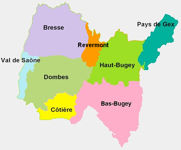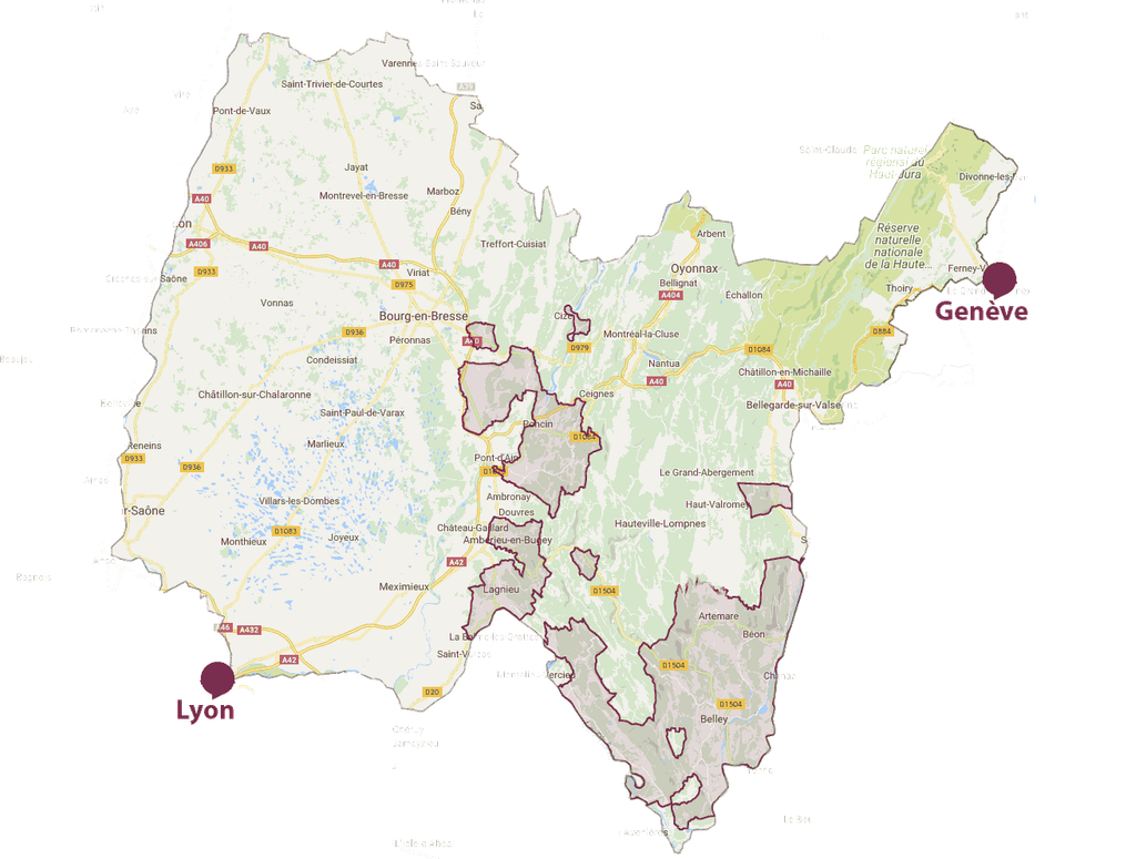Puis à l'Est de la Bresse, dans la zone médiane du département de l'Ain se trouve une zone viticole avec un sol calcaire: le Bugey.