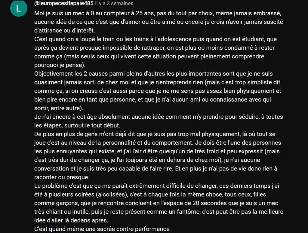 Mais nonobstant j'ai pas couché depuis des années, en fait tout ça m'a saoulé et rendu complètement redpilled sur les relations, ça m'intéresse plus