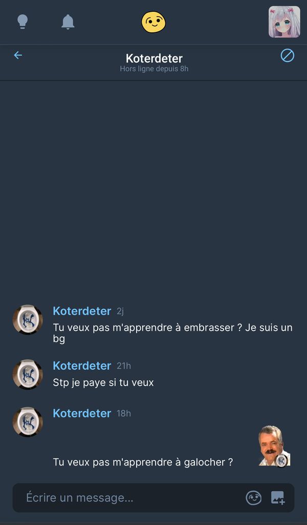 Un membre d’ici m’HARCELE en mp nyan ..