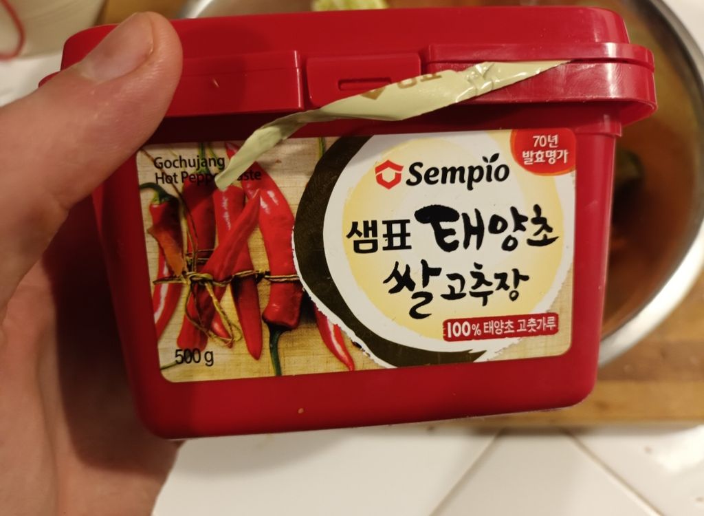 - 2 cuillères à soupe de pâte de piments coréen (normalement on utilise plutôt du piment en poudre, plus facile à mélanger, j'essayerais un jour, mais pour le moment je reste fidèle à ma recette)