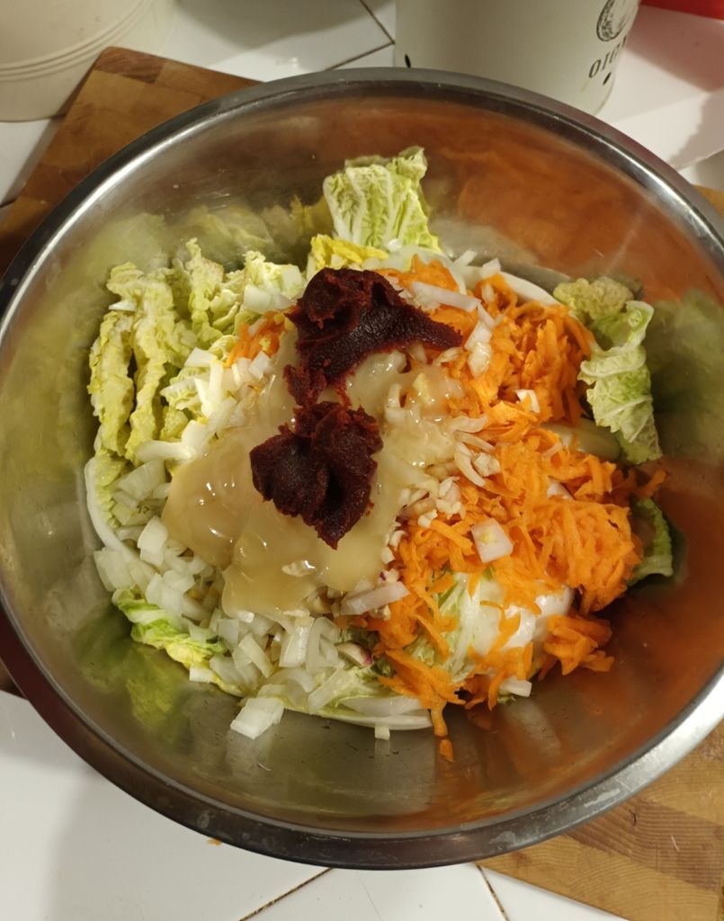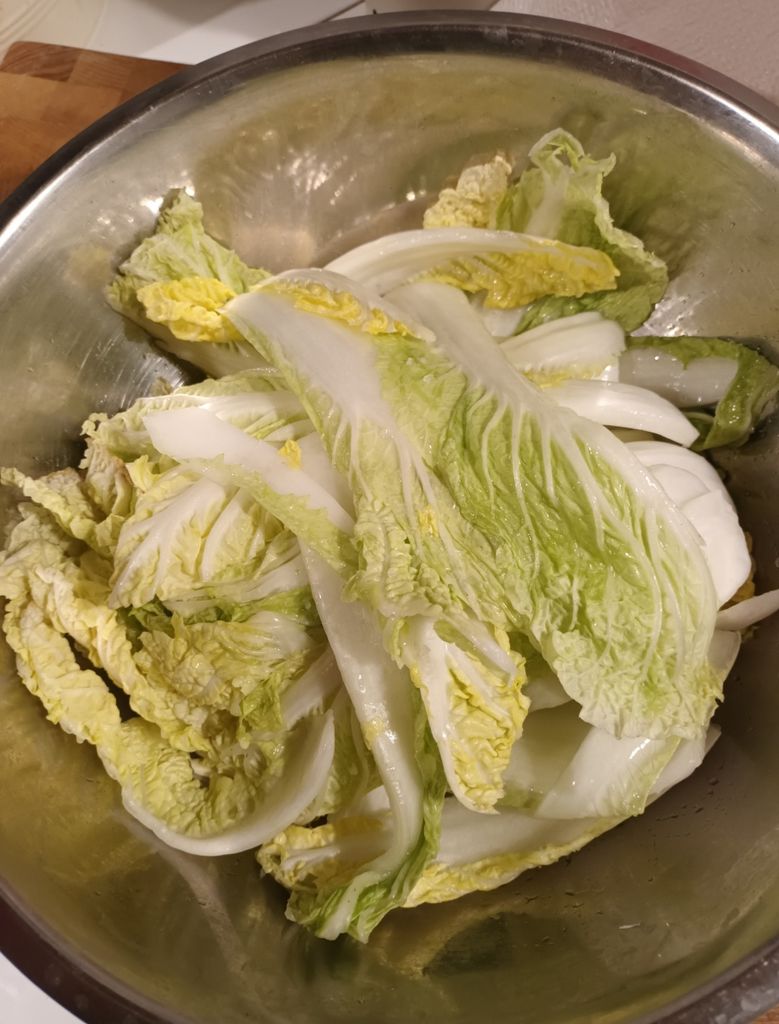 1- on coupe le choux en quatre, libère les feuille, et on le met au sel. On fait de même avec nos carottes rapées. On laisse 6-8h (je fais ça le matin et le kimchi le soir, donc bien plus des fois, il faut que ca rende du jus et que ca ramolisse le choux)
