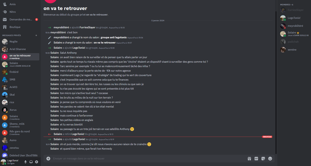 Et oui le groupe est dead depuis bientôt 2 ans, ce qui ne concorde pas à ta vision des faits d'harcèlement depuis 3 ans (d'ailleurs tu avais été ban et j'ai des messages où tu nous supplies de revenir, suite à tes scams