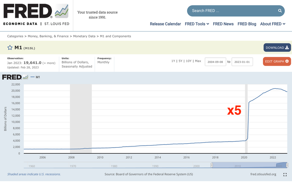 La Fed a imprimé plus de dollars entre 2008 et 2012 qu'entre 1913 (date de création du dollar actuel) et 2008, et plus de dollars entre 2020 et 2022 que depuis 1913 jusqu'à la fin 2019.