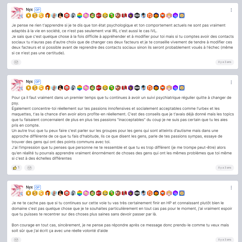Je ne pense pas que tes conseils et ton aide ont été très efficaces puisque notre personnage national continue ses troubles 3 ans après...