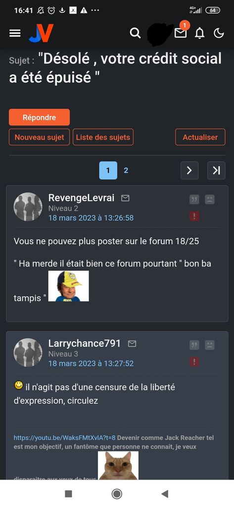 AYA tout à l'heure je voulais tester un compte voir si j'étais encore ban, je clique donc sur un topic et je marque un message pour faire le test, je suis donc à la page pour me connecter, je me connecte je reviens au topic pour poster là paf il était 410, alors qu'il y avait aucune raison, le truc a même pas tenu 15 secondes
