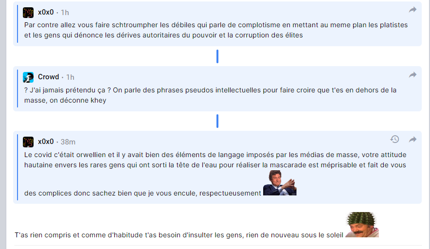 C'est pastèque qui m'a adressé la parole en disant "T'as rien compris et comme d'habitude t'as besoin d'insulter les gens, rien de nouveau sous le soleil"