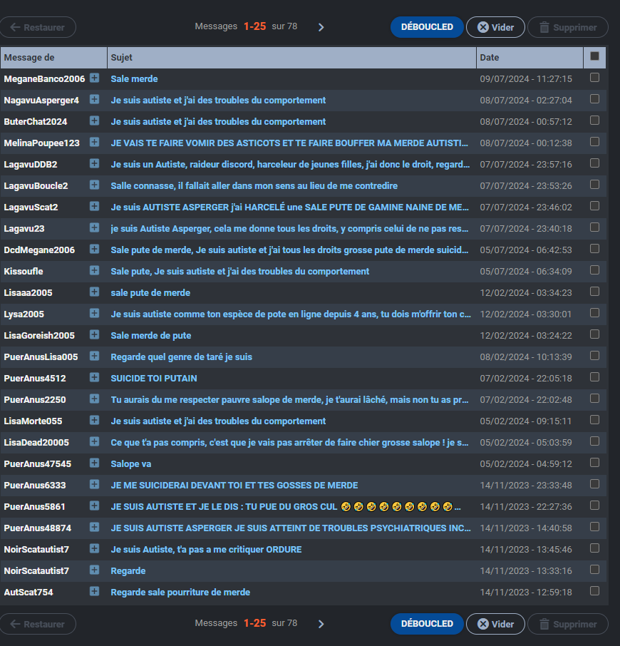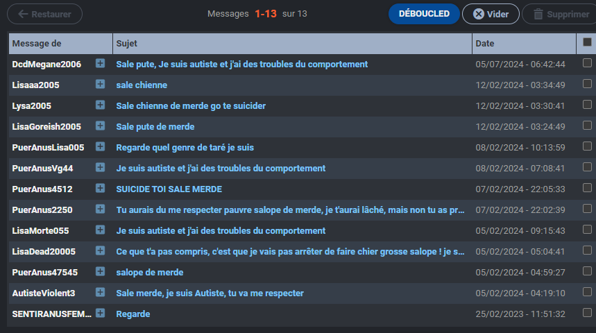 c'est intolérable qu'un type comme ça harcele depuis des annes des gens sur internet et des discords, il devrait y avoir une plainte commune pour faire enfermer ce taré
