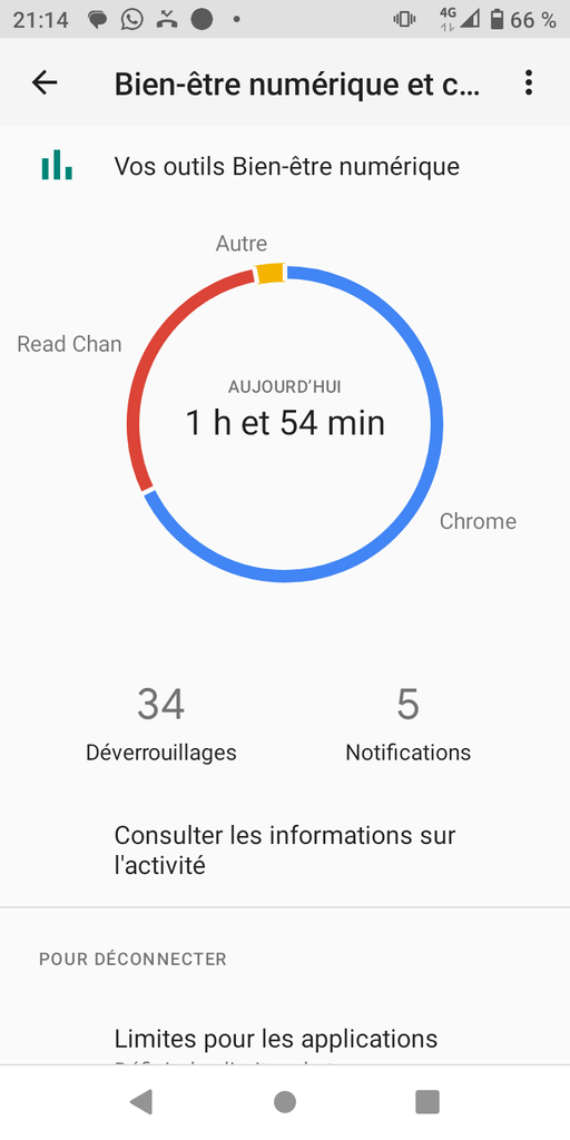 @Sainte Pour le visualiser, rendez-vous dans Paramètres > Bien-être numérique et contrôle parental, où s'offre à vous un récapitulatif du temps passé sur le terminal. Un diagramme circulaire vous indique ainsi le temps passé le jour même sur vos apps