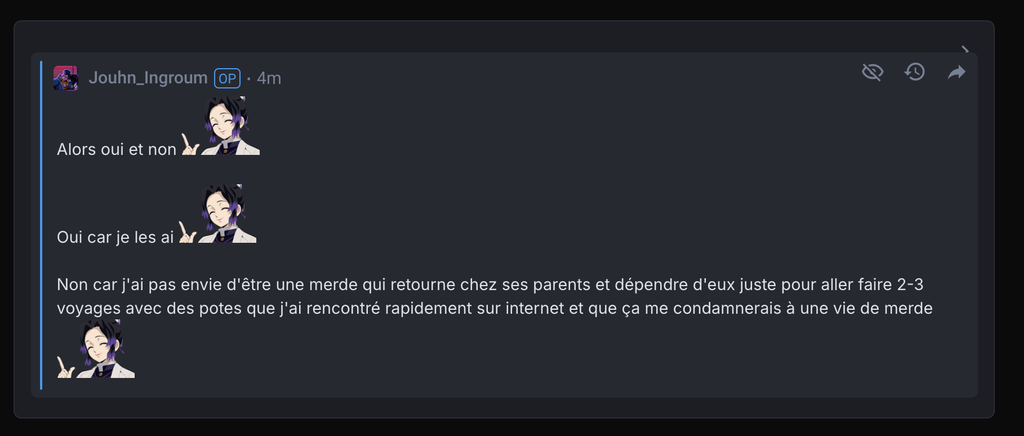 Non car j'ai pas envie d'être une merde qui retourne chez ses parents et dépendre d'eux juste pour aller faire 2-3 voyages avec des potes que j'ai rencontré rapidement sur internet et que ça me condamnerais à une vie de merde