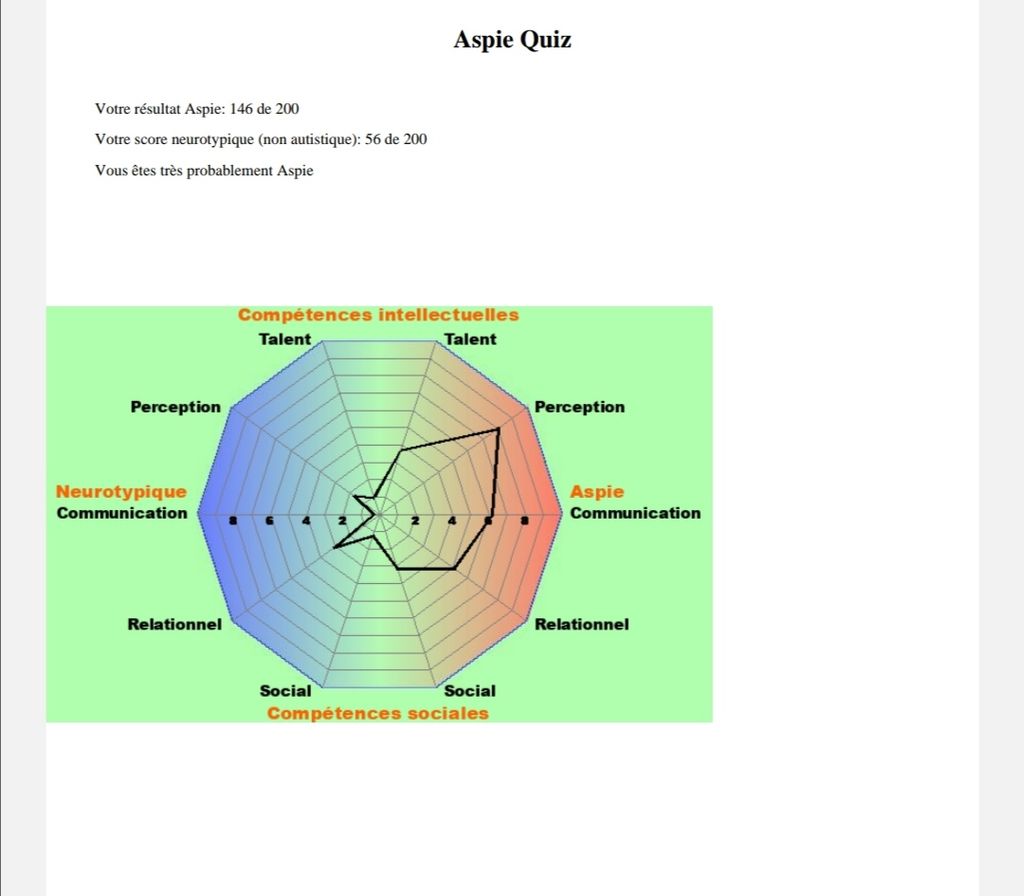 En vrai j'arrive pas à savoir si je suis neurotypique avec juste éventuellement des traits autistiques un peu marqués ou alors avec un autisme suffisamment léger pour ne pas avoir été repéré (après vu comment les TSA sont très mal gérés en France c'est pas rare de ne pas être repéré dès l'enfance) oui si j'ai d'autres soucis sur le plan psy qui pourraient ressembler à un TSA mais sans l'être...