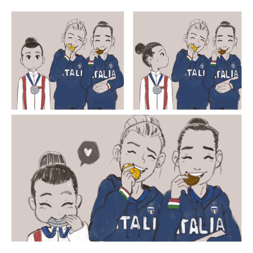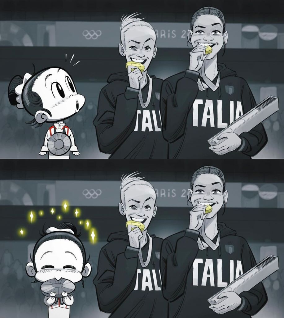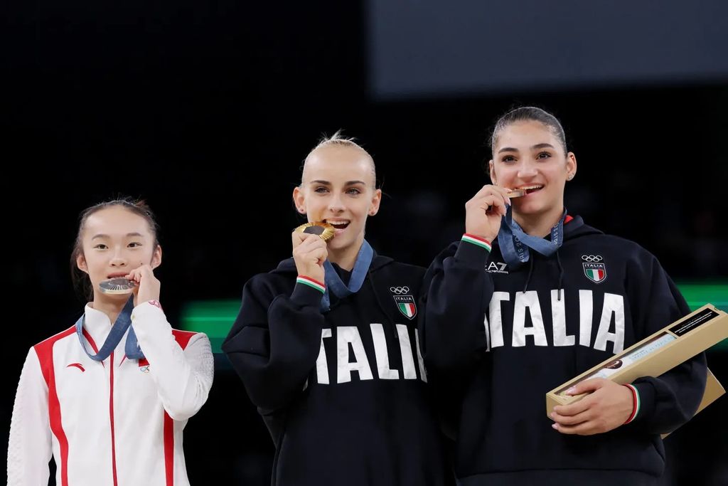 Médaillée d’argent de l’épreuve de la poutre en gymnastique, Zhou Yaqin a croqué timidement dans sa médaille pour imiter les Italiennes Alice D’Amato et Manila Esposito.