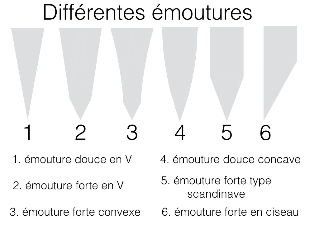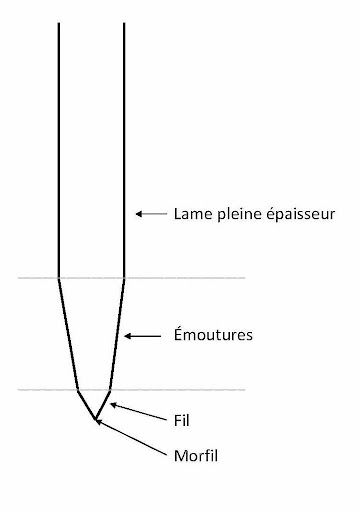 Composition d’une lame. L’emouture c’est la partie où tu enlèves de la matière quand tu aiguise. Le fil bah c’est le tranchant en lui même, et le morfil c’est le point de convergence des deux parties du fil. Grosso modo, sur un tranchant en V, ton emouture et ton fil sont alignés et forment un tranchant plus profond, c’est ce qu’ils appellent en coutellerie une emouture douce.