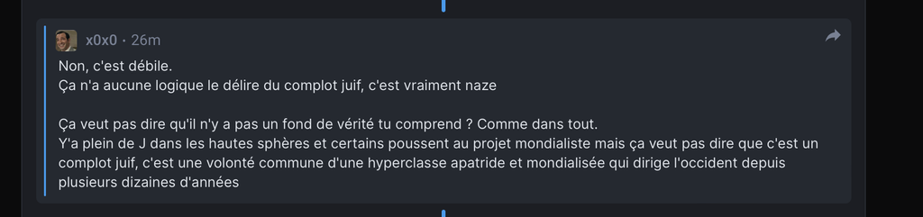 Mettre ta réponse où tu dis en fin de post que oui ils sont juifs et magouille mais que c'est pas une généralité blablabla et la sienne côte à côte