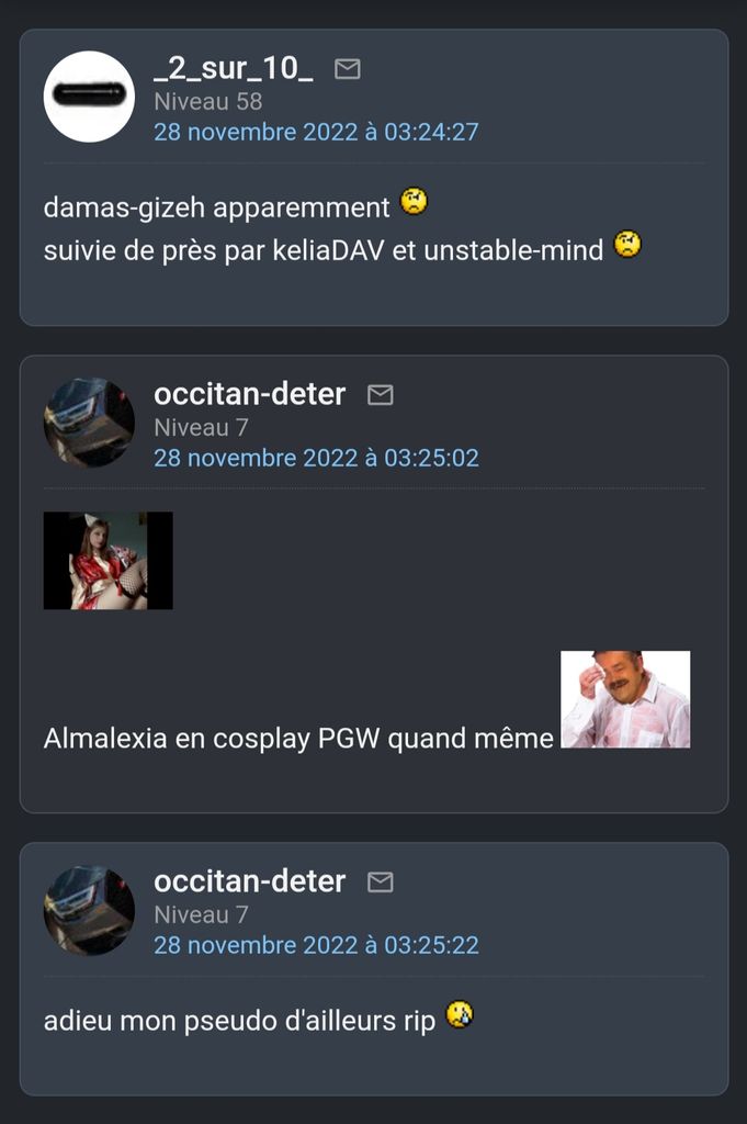 Perso la je suis juste salé parce que je me suis fait chier dessus à outrance... C'est même pas une histoire de mec ou de meuf parce que l'autre mec du Discord a décidé de me chier dessus finalement alors que j'avais décidé de me confier en MP