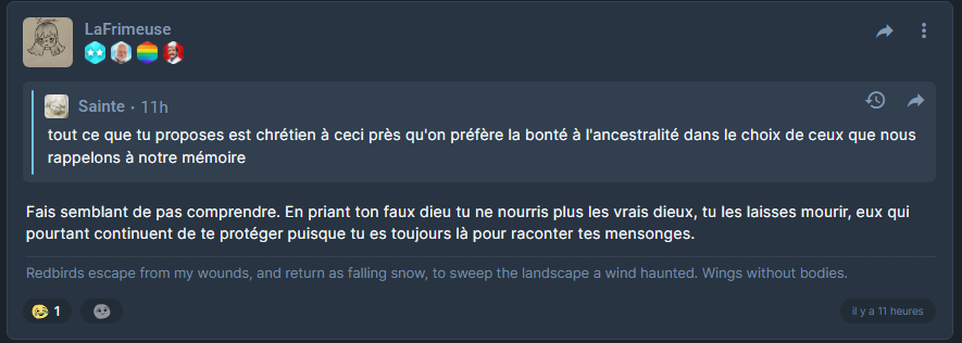 pourquoi dis-tu que je n'ai aucune preuve ? pour moi Dieu c'est une condition nécessaire à la possibilité du sens, et le sens est indéniable, je ne vois même pas comment on peut s'en passer sans s'interdire de vivre