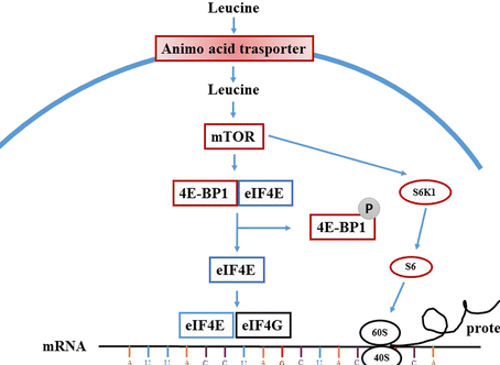 "La leucine augmente la synthèse des protéines par activation de la voie de signalisation mTOR. La leucine a amélioré la synthèse musculaire via la voie de la cible mammifère de la rapamycine (mTOR), conduisant à la phosphorylation de ses protéines cibles en aval, la protéine de liaison au facteur d'initiation eucaryote 4E (4E-BP1) et la p70 ribosomale S6 kinase 1 (S6K1). Dans des conditions non phosphorylées, 4EBP1 se lie étroitement à eIF4E, formant le complexe inactif eIF4E · 4EBP1. Dans des conditions anaboliques, mTORC1 induit la phosphorylation de 4EBP1, entraînant la dissociation de eIF4E du complexe inactif et permettant à eIF4E de former un complexe actif avec eIF4G. Le processus d'association de eIF4E avec eIF4G est obligatoire pour la liaison du complexe de pré-initiation 43S avec l'ARNm. S6K1 est un autre substrat mTORC1 qui participe à la régulation de la traduction de l'ARNm. Cette kinase joue un rôle important dans la régulation de l'ARNm terminal de l'oligopyrimidine qui est responsable de la traduction des protéines impliquées dans l'appareil de synthèse des protéines."