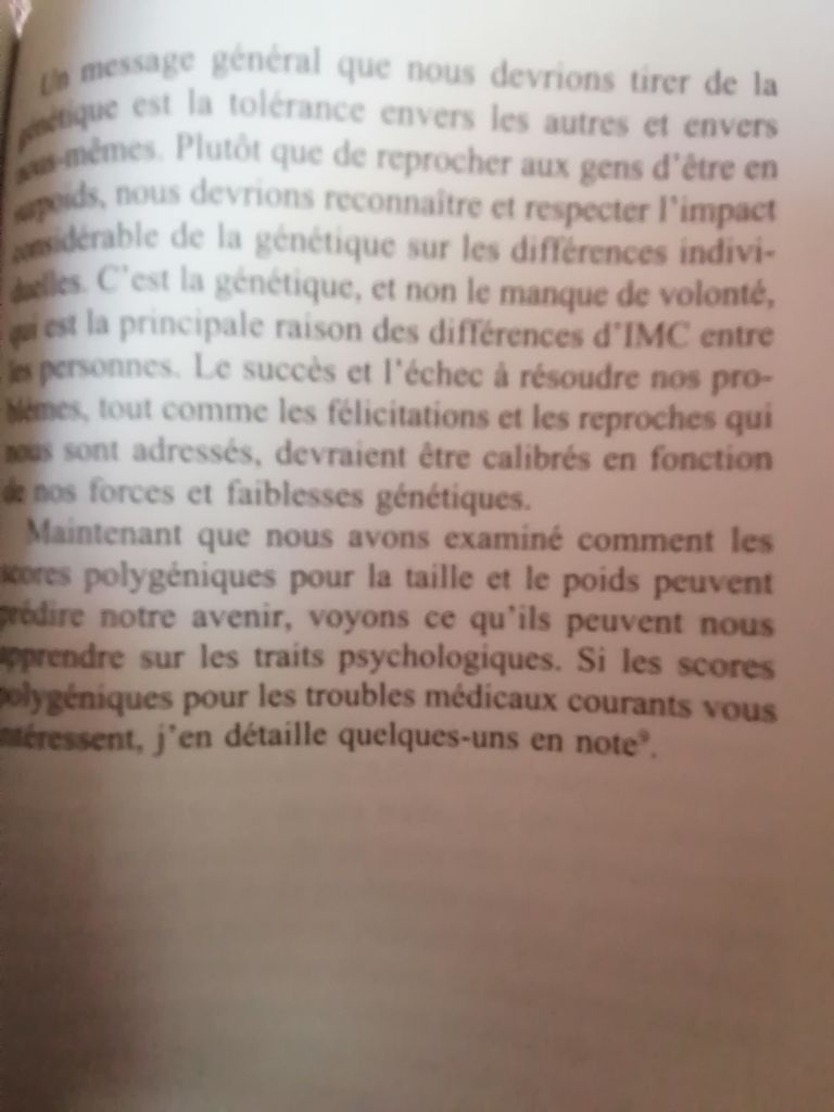 Je viens de lire ce livre pour l'auteur beaucoup de caractèristiques psychologique (personalité, reussite scolaire...) seraient predictibles à environ 50 % par la génétique ( de manière plutôt polygénique) avec des exceptions comme la religiosité ou l'orientation politique qui seraient liés plus fortement à l'éducation.