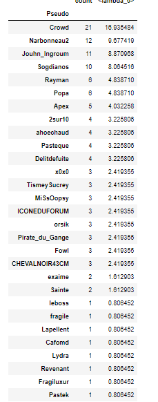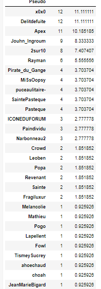Tu l'as probablement beaucoup mentionné avec le @, mais pas souvent écrit son pseudo en texte brut (la BDD que j'analyse n'a pas réussi à récupérer les mentions, ni les pseudos à qui ça répond)