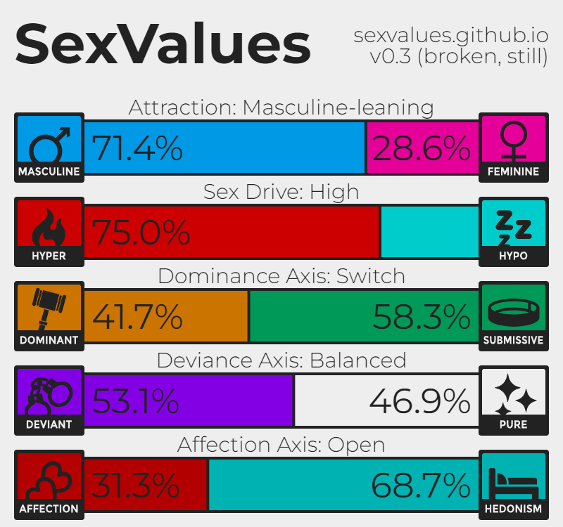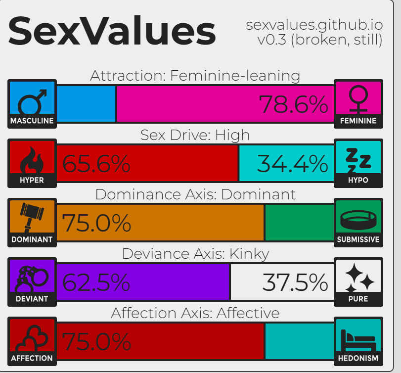 Bon ça correspond pas mal à la réalité à part que je sais pas pourquoi j'ai pas fait 100% en attraction féminine