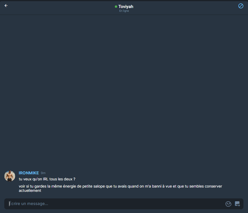 Tu veux répondre quoi après ? "Non je ne suis pas une salope d'une lâcheté effarante même virtuellement, qui ne sort du buisson dont je suis caché que lorsque les gens que j'aime pas sont à terre" ? Fin bon heureusement qu'il se rend compte qu'il peut plus se défendre sur le sujet sinon ce serait encore plus pathétique