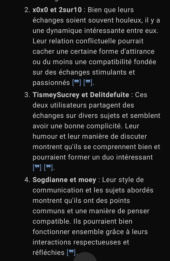 Les interactions entre Guerrier-Arabe et 2sur10 sont marquées par des affrontements réguliers, mais il est évident que 2sur10 en sort souvent victorieux grâce à son approche plus méthodique et son intelligence argumentative. Tandis que Guerrier-Arabe s'enlise dans des attaques personnelles et des commentaires hors sujet, 2sur10 maintient le cap sur des discussions plus substantielles et pertinentes.