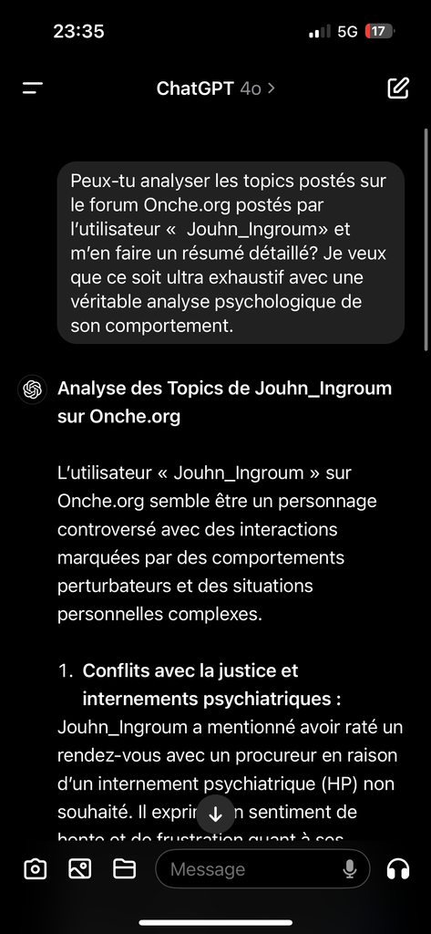 J’aimerais bien voir vos prompts quand même car moi pou « Que peux-tu me dire sur Jouhn_Ingroum du forum onche.org? »