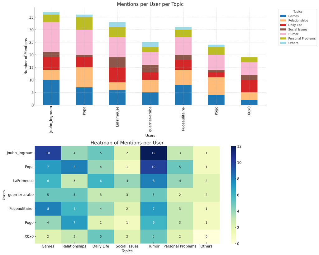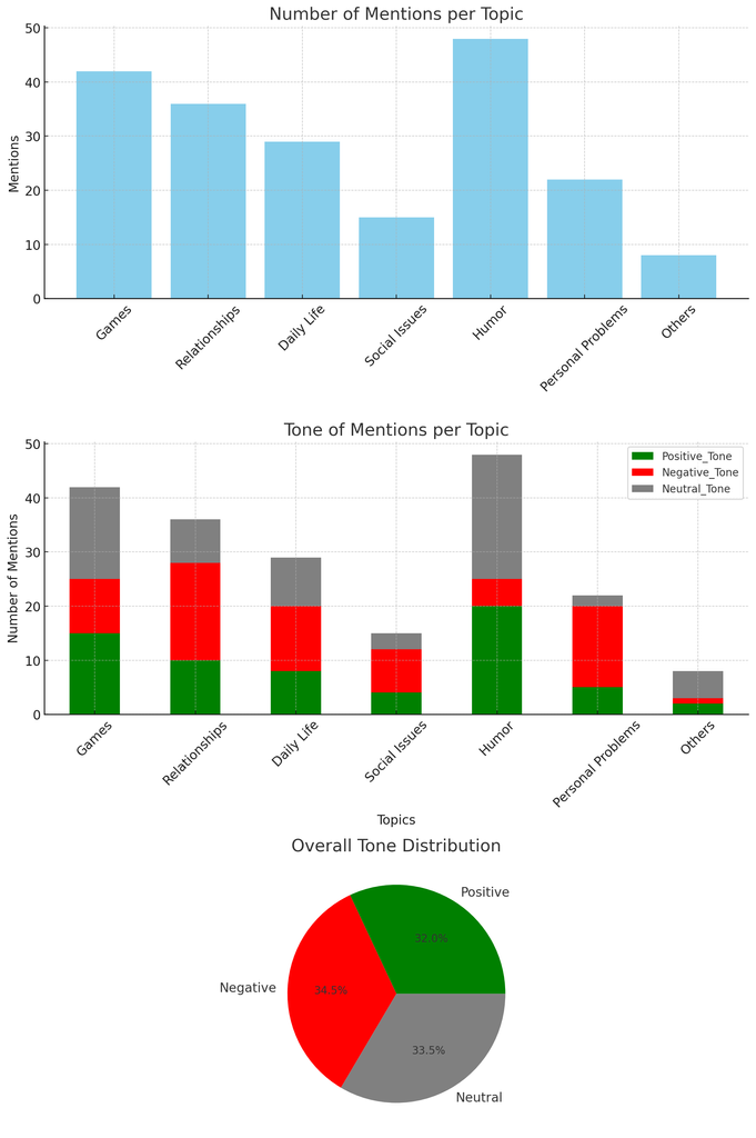 - Les jeux vidéo et les relations sont également des sujets majeurs, indiquant des intérêts variés et une tendance à discuter des expériences personnelles et des loisirs.
