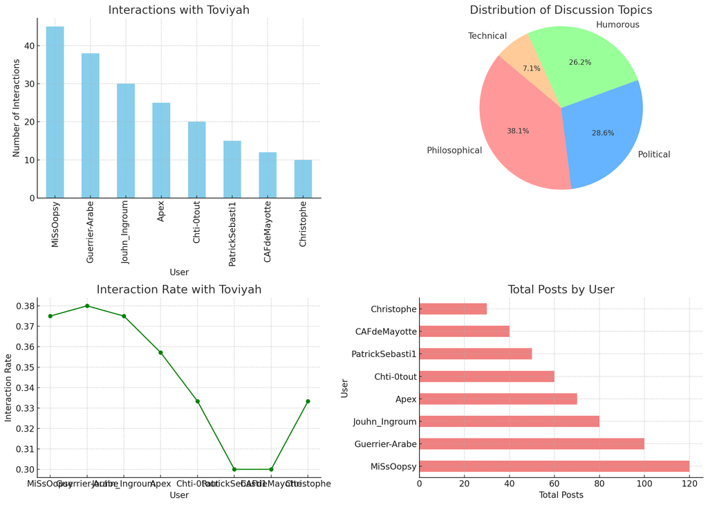 1. Interactions avec Toviyah : Ce graphique montre le nombre d’interactions de Toviyah avec différents utilisateurs. MiSsOopsy et Guerrier-Arabe sont les utilisateurs les plus interactifs avec Toviyah.