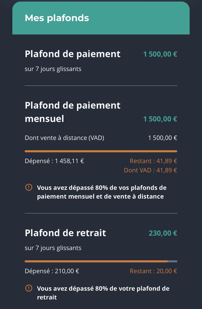 Je viens de retirer 120€ (je peux pas retirer plus) et je peux pas augmenter les plafonds (vu l’heure…).