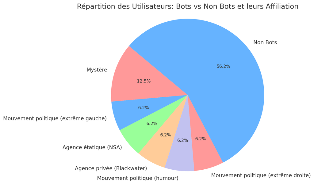 • Bots avec Affiliation : Représente les bots avec leurs affiliations respectives (mouvements politiques, agences étatiques, agences privées, ou mystère).