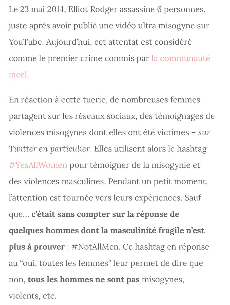 Je cite « En réaction à cette tuerie, de nombreuses femmes partagent sur les réseaux sociaux, des témoignages de violences misogynes dont elles ont été victimes – sur Twitter en particulier. Elles utilisent alors le hashtag #YesAllWomen pour témoigner de la misogynie et des violences masculines. Pendant un petit moment, l’attention est tournée vers leurs expériences. Sauf que… c’était sans compter sur la réponse de quelques hommes dont la masculinité fragile n’est plus à prouver : #NotAllMen. Ce hashtag en réponse au “oui, toutes les femmes” leur permet de dire que non, tous les hommes ne sont pas misogynes, violents, etc. »