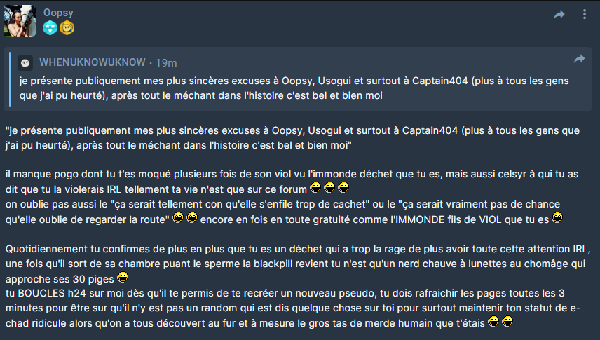En revanche je constate que ça commence à devenir de plus en plus violent, jusqu’à vouloir régler des comptes en dehors du forum.
