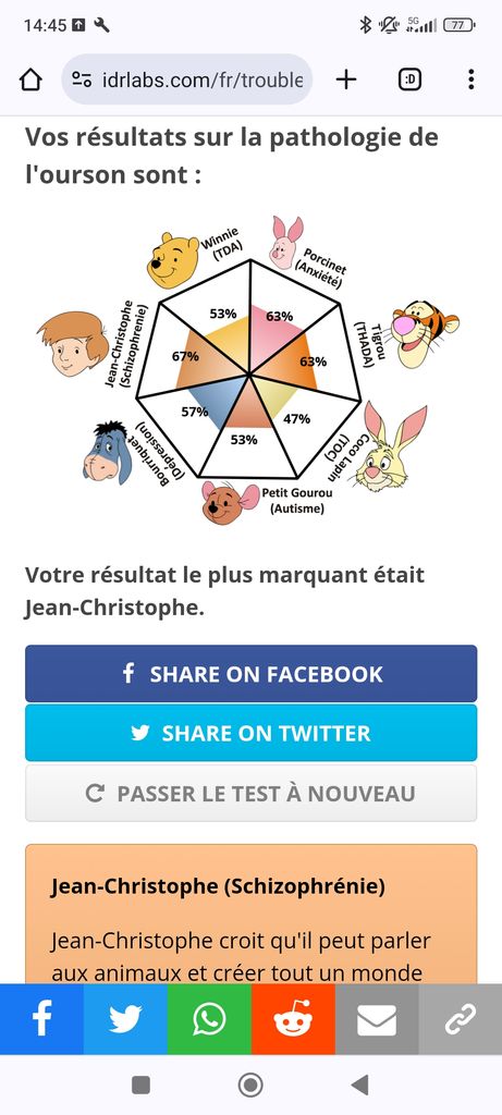 Jean-Christophe croit qu'il peut parler aux animaux et créer tout un monde imaginaire dans lequel lui seul vit. Il a probablement deux états du moi distincts : un état ordinaire dans le monde réel et un état magique dans le Bois des Cent Acres. Son expansivité cognitive excessive a créé ce monde et tous les personnages qui le composent - un théâtre où il joue tous les rôles. Les différentes personnalités de chaque personnage sont, en réalité, des fragments de sa propre personnalité projetés sur des animaux en peluche. Il entend des voix, même lorsqu'il est seul, et présente des altérations de la mémoire, de la conscience et de la perception. Ses schémas de pensée inhabituels sont persistants et ne sont pas liés à des incidents isolés
