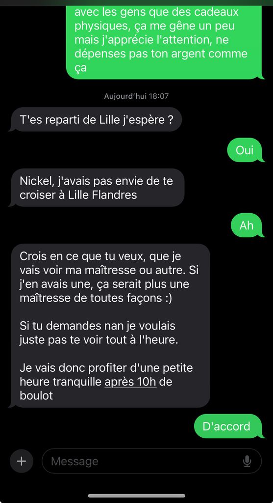 Enfin je comprends pas, on devaient se voir mais vu que j’ai décliné et refusé son cadeau je n’ai pas eu de réponse et elle me relance comme ça pour dire ça