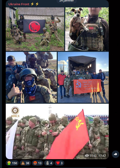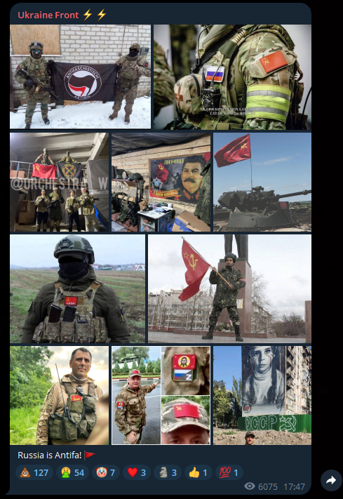 Ce sont des combattants de l'armée russe en Ukraine avec des symboles pro-communistes et anti-fascistes.