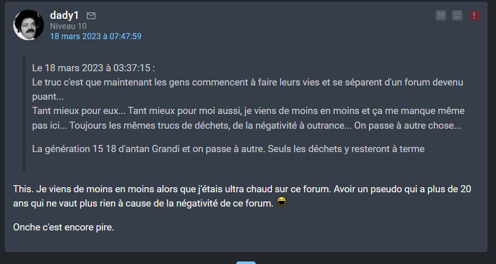 6. JVC se condamne tout seul, en gros le plan c'est qu'il y'aura de plus en plus de ban, et à chaque ban, t'as des nouveaux comptes qui peuvent que très peu poster, donc ce qu'il va se passer, c'est que pas mal de khey en auront marre et finiront par venir ici, ensuite comme on finira par être plus actif que là bas, une majorité de khey viendront
