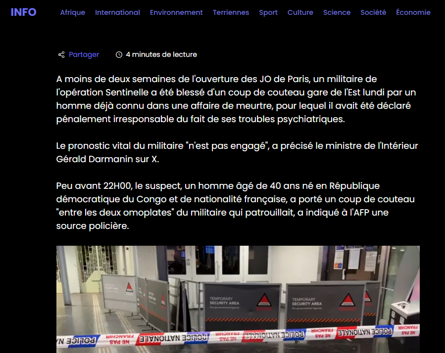 A moins de deux semaines de l'ouverture des JO de Paris, un militaire de l'opération Sentinelle a été blessé d'un coup de couteau gare de l'Est lundi par un homme déjà connu dans une affaire de meurtre, pour lequel il avait été déclaré pénalement irresponsable du fait de ses troubles psychiatriques.