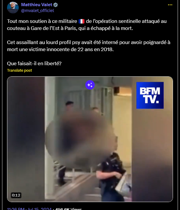 Tout mon soutien à ce militaire 🇫🇷 de l’opération sentinelle attaqué au couteau à Gare de l’Est à Paris, qui a échappé à la mort.