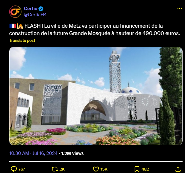 🇫🇷🕌 FLASH | La ville de Metz va participer au financement de la construction de la future Grande Mosquée à hauteur de 490.000 euros.