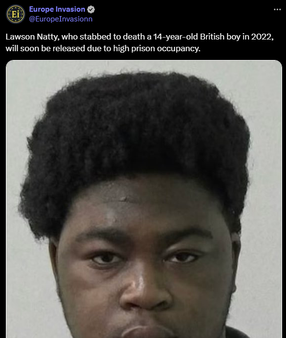 Lawson Natty, qui a poignardé à mort un garçon britannique de 14 ans en 2022, sera bientôt libéré en raison du taux d'occupation élevé des prisons.