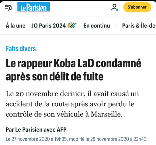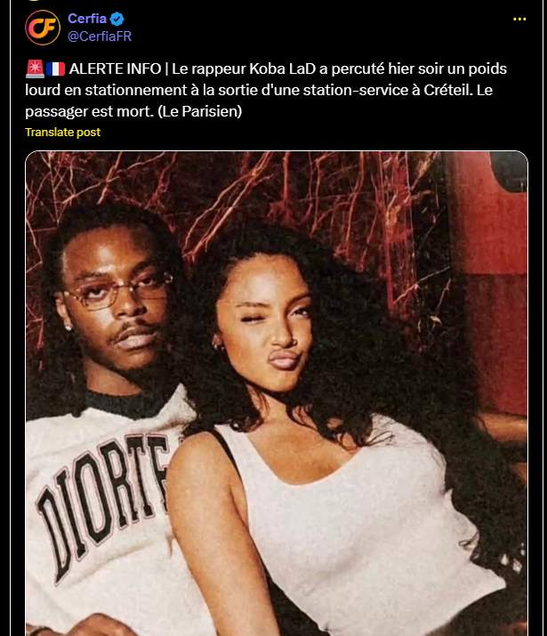 🚨🇫🇷 ALERTE INFO | Le rappeur Koba LaD a percuté hier soir un poids lourd en stationnement à la sortie d'une station-service à Créteil. Le passager est mort. (Le Parisien)