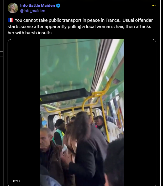 On ne peut pas prendre les transports en commun en toute tranquillité en France. Le délinquant habituel commence la scène après avoir apparemment tiré les cheveux d'une femme locale, puis l'attaque avec de dures insultes.