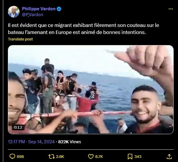 Il est évident que ce migrant exhibant fièrement son couteau sur le bateau l’amenant en Europe est animé de bonnes intentions.