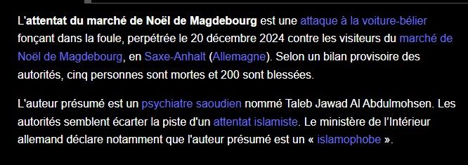 L'idéologie de l'islam, du Coran, permet d'attaquer plusieurs pays depuis des siècles dans des guerres, les médias juifs veulent victimiser de manière odieuse les adeptes de cette idéologie en faisant croire que le tueur de l'attentat en Allemagne qui est d'origine saoudienne, serait un anti islam, islamophobe. C'est un traitement anti occidental en parlant en plus d'un parti politique extrémiste de droite que le tueur aurait adhéré alors qu'il obtient un séjour illimité, le premier réflexe des médias est de dire qu'il est islamophobe et écarte l'attentat islamiste alors que c'est un attentat contre des Occidentaux dans un marché d'une festivité nordique par un type d'origine saoudienne, les victimes, tu as des enfants qui ont été percutés, des couples, autrement dit, c'est insulter les peuples et surtout minimiser l'idéologie islamique qui a bien été utilisée pour plusieurs attentats.