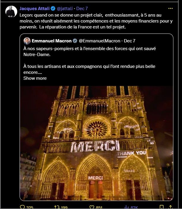 Jacques Attali, le juif, avoue qu'il a passé sa vie à nuire à la France en ce sens qu'il mentionne un lieu maçonnique, Notre-Dame, comme un projet de réparation du pays en l'associant avec des financiers qui ont fait en sorte de payer moins d'impôts, acte insignifiant et inutile, la tolérance abrahamique dans les mensonges, la construction de mosquées, les attentats, le rejet abrahamique avait permis d'avancer que de rester dans des affirmations grotesques de Messie, de création en six jours.