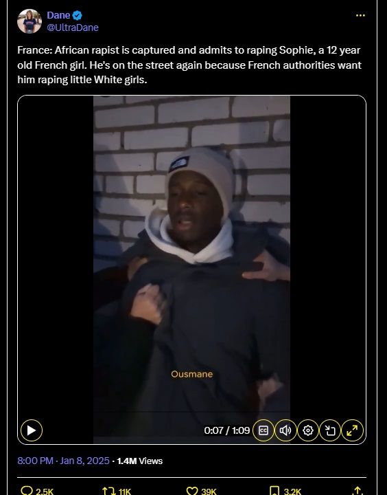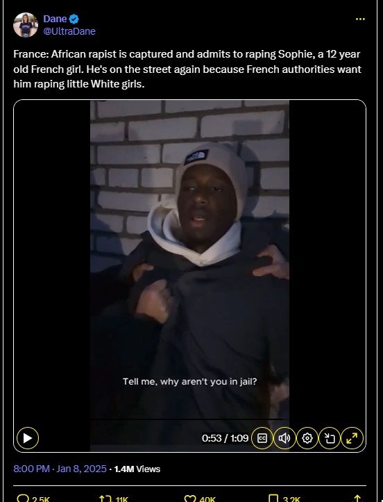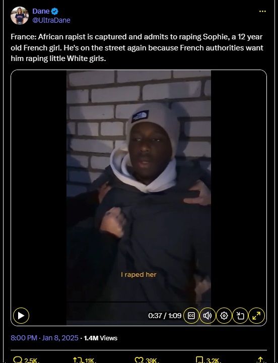 France : Un violeur africain est arrêté et avoue avoir violé Sophie, une jeune française de 12 ans. Il est de nouveau dans la rue car les autorités françaises veulent qu'il viole des petites filles blanches.
