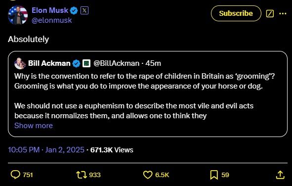 Le milliardaire de la tech a pointé la responsabilité de Keir Starmer, premier ministre britannique, dans la gestion d’un scandale de viols collectifs sur mineurs, commis par des gangs d’origine majoritairement pakistanaise.