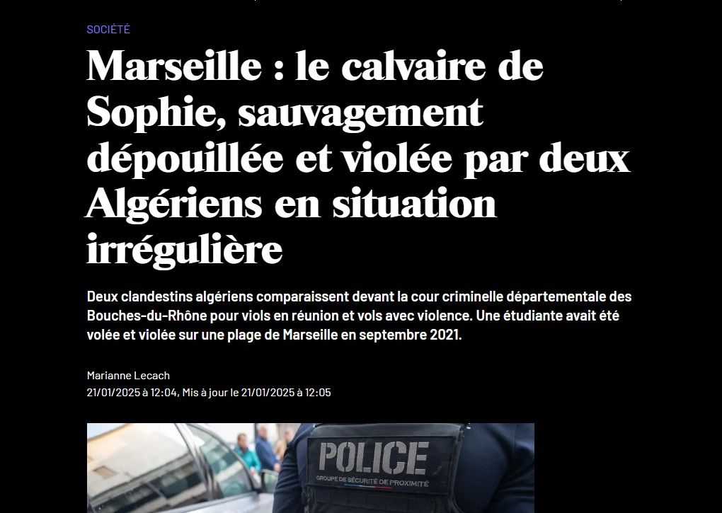 Deux clandestins algériens comparaissent devant la cour criminelle départementale des Bouches-du-Rhône pour viols en réunion et vols avec violence. Une étudiante avait été volée et violée sur une plage de Marseille en septembre 2021.