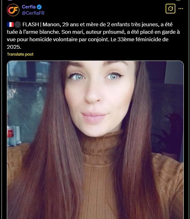 🇫🇷⚫️ FLASH | Manon, 29 ans et mère de 2 enfants très jeunes, a été tuée à l’arme blanche. Son mari, auteur présumé, a été placé en garde à vue pour homicide volontaire par conjoint. Le 33ème féminicide de 2025.