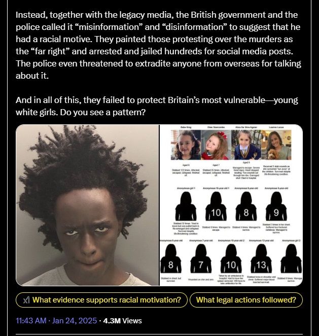 Le monstre de Southport n’a pas seulement tué trois petites filles blanches. Il les a poignardées des centaines de fois, et il a poignardé presque une douzaine d’autres filles presque autant de fois, traînant même les blessées vers le centre alors qu’elles fuyaient pour pouvoir les découper encore plus. Plus tard, il se moquait de la police et exprimait qu’il était heureux qu’elles soient mortes. Le gouvernement de Starmer savait tout cela, et connaissait ses motivations anti-blanches, sur la base de ses listes de lectures, et n’a révélé à personne les détails sanglants. Au lieu de cela, avec l’aide des médias traditionnels, le gouvernement britannique et la police ont qualifié de « désinformation » et de « désinformation » le fait de suggérer qu’il avait un mobile racial. Ils ont présenté ceux qui protestaient contre les meurtres comme « d’extrême droite » et ont arrêté et emprisonné des centaines de personnes pour des publications sur les réseaux sociaux. La police a même menacé d’extrader quiconque d’outre-mer pour en avoir parlé. Et dans tout cela, ils n’ont pas réussi à protéger les plus vulnérables de Grande-Bretagne : les jeunes filles blanches. Voyez-vous un schéma ?